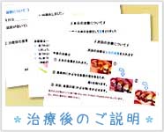 治療後に注意事項についてお話ししますが、全部覚えるには数が多すぎたり、家に着いてほっとしたときに忘れてしまったりして、「麻酔が切れるまで、気をつけることは何だったかな?」「強く噛んだら仮づめのところが痛いけど、いいのかな……」と心配されることもあるのでは?と考え、その不安を軽減すべく、「本日の治療内容」と「治療後の注意事項」を書いた用紙を作成しました。
