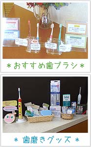 待合室の棚には、スタッフが充分に検討し選択した、自信を持っておすすめするハブラシがあります。