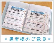 待合室に置いてあるファイルには、定期健診を実際に受けていらっしゃる患者様からいただいた生の声があります。私たちからの説明とはまた違う、説得力あるご意見ばかりですので、ご来院の際は、ご覧ください。