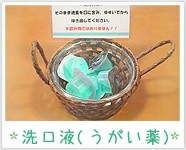 待合室と洗面台には、治療前あるいは治療後に口の中をさっぱりしていただくために洗口液(うがい薬)を置いています。子供からお年寄りまで使えるように、刺激の少ないものを選びました。
